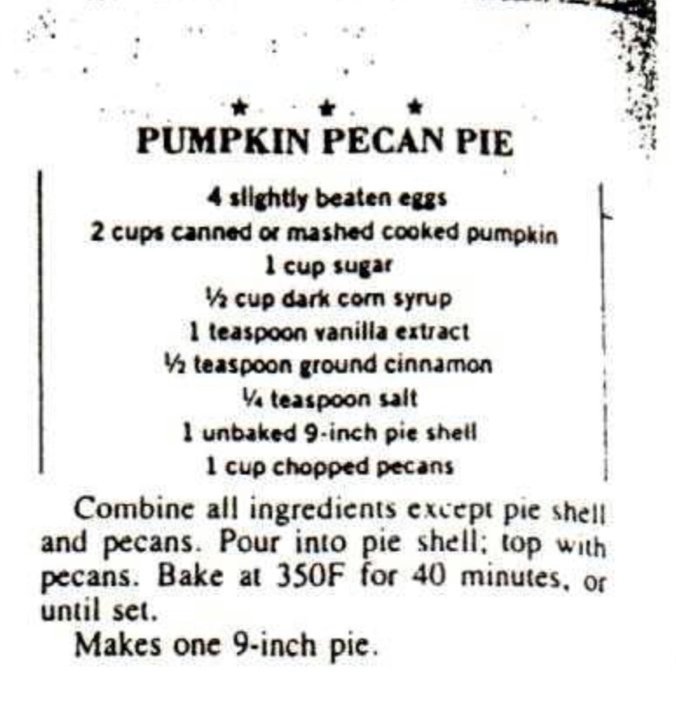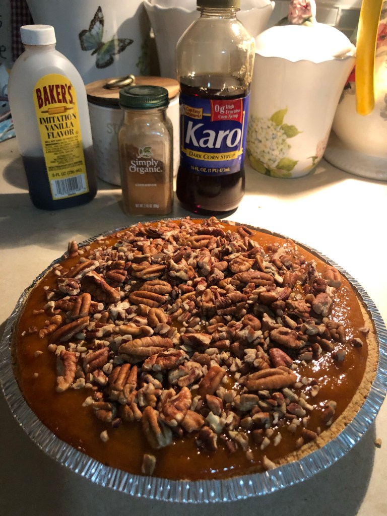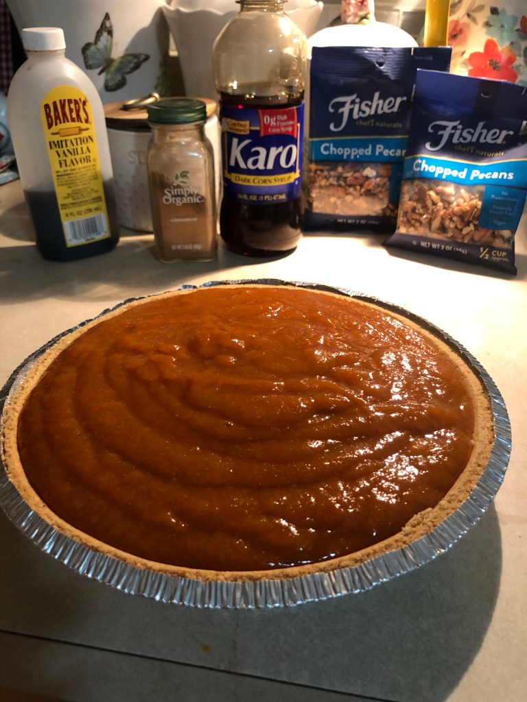 I found this in an old cookbook from the 80s called A Cook’s Tour of the Azalea Coast, from Wilmington, NC. I used pecan halves arranged on top, and had to cook it quite a bit more than the recipe, like 60-70 minutes. It is really delicious. The nuts, syrup and vanilla make you think pecan pie, and the pumpkin and cinnamon make you think pumpkin pie. I like the fact that it does not have pumpkin spice in it, to make it taste like its own thing, but you certainly could use that instead of cinnamon if you wanted to. Must use a deep dish pie crust though. The pie will fluff up when done, then it falls back even when cooled.