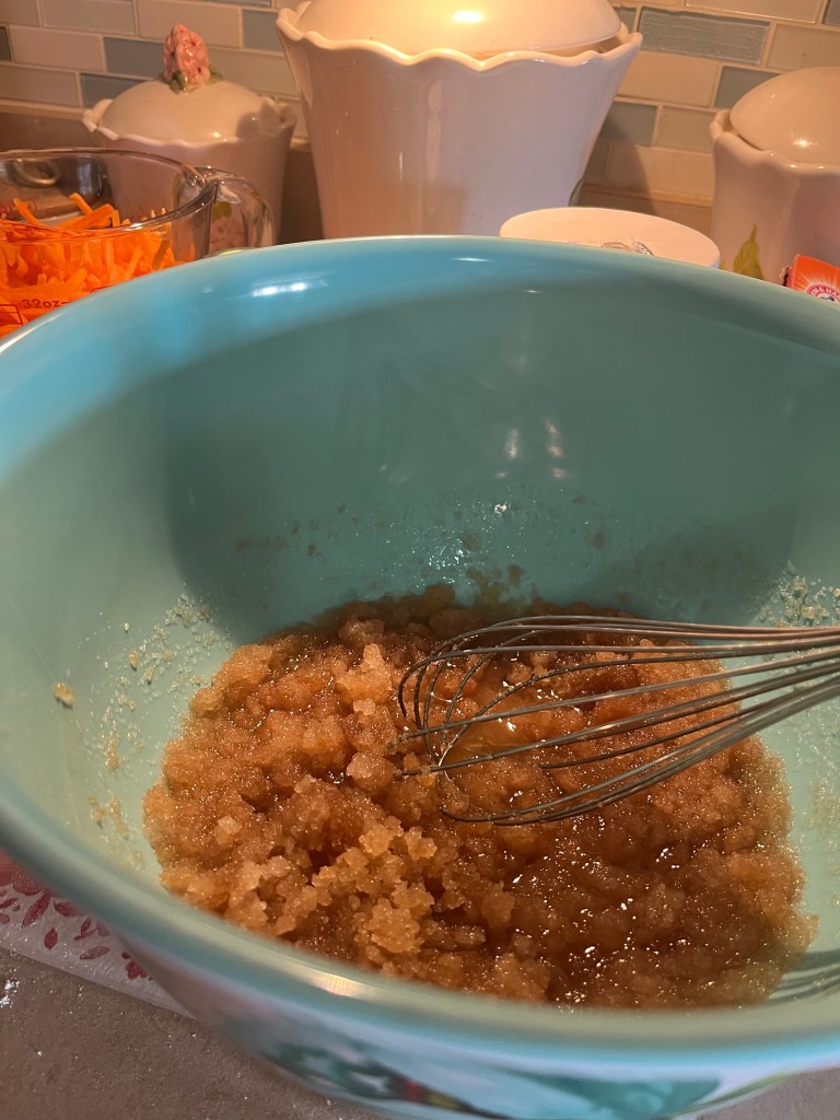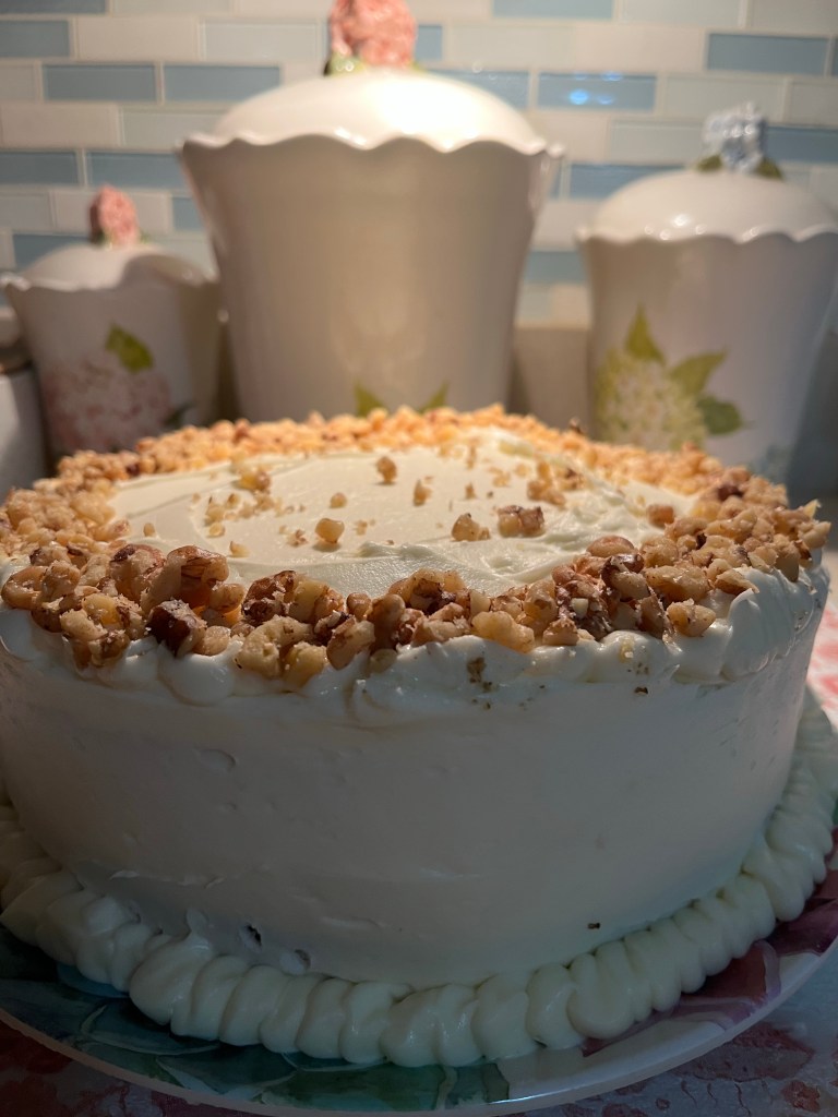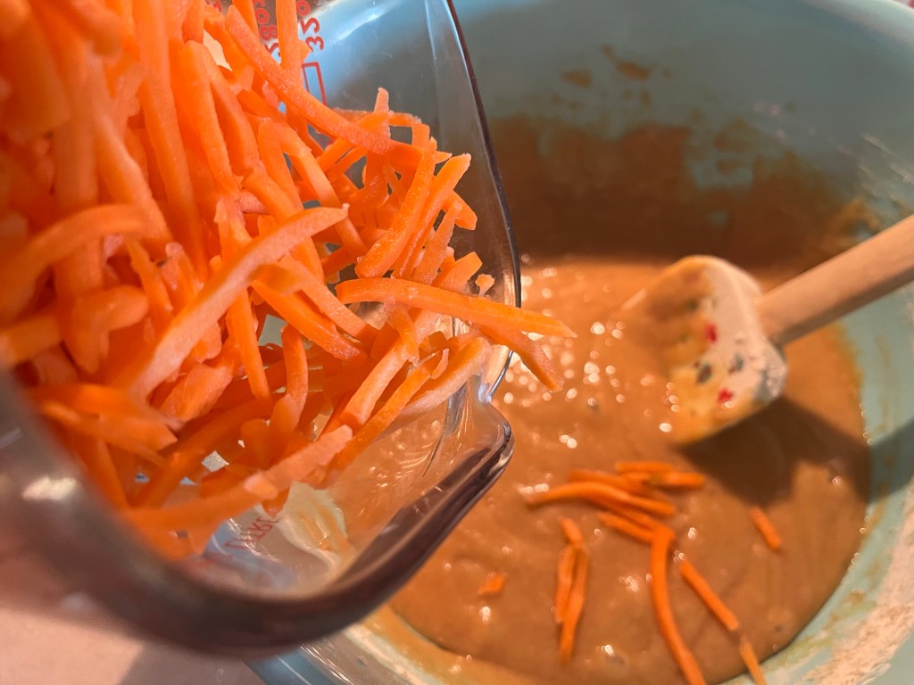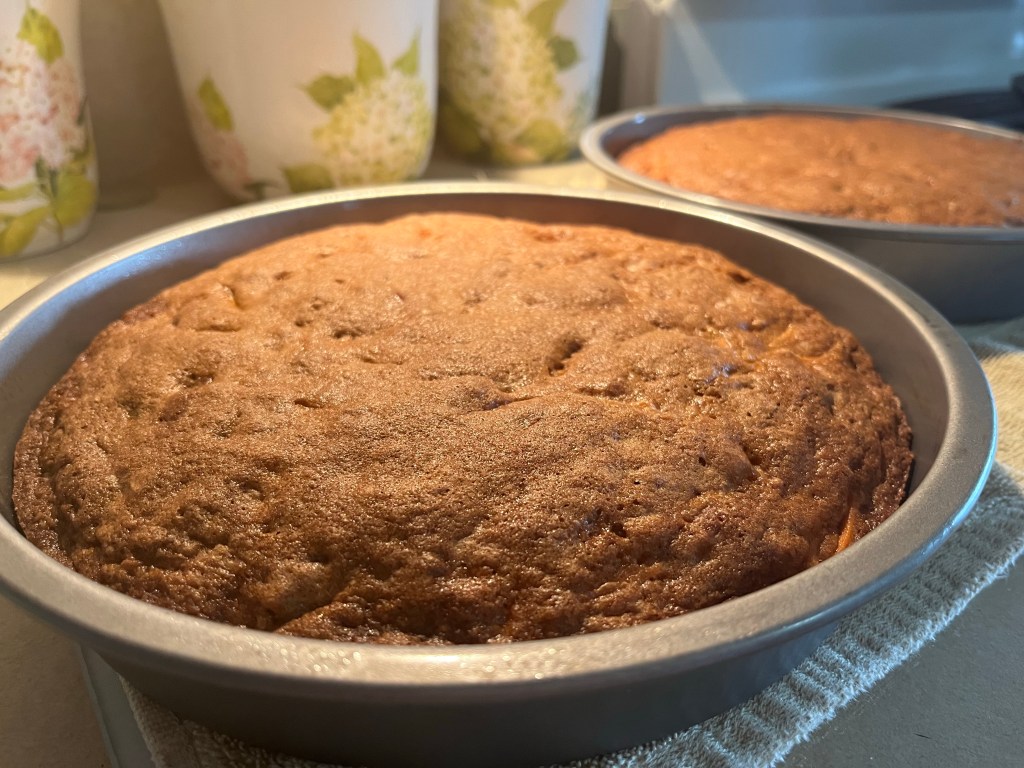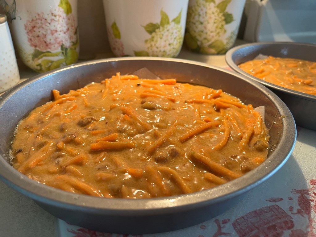 Here’s what you will need for the Carrot Cake batter Whisk flour, baking soda, salt, and cinnamon in a medium bowl until very well blended.In a separate bowl, whisk the oil, granulated sugar, brown sugar, and vanilla.Add the eggs one at a time and whisk after each one Add the flour mixture Switch to a large rubber spatula. Scrape the sides and bottom of the bowl, then add the dry ingredients in three parts, gently stirring until they disappear and the batter is smooth.Add the carrots…and the nuts. I used a mixture of pecans and walnuts. Divide the cake batter into two prepared cake pans: two greased 9-inch round cake pans. Line the bottom with parchment paper and then grease the top. Or grease and flour the bottom and sides of both pans.Bake until the tops of the cake layers are springy when touched and when a toothpick inserted into the center of the cake comes out clean, 35 to 45 minutes.