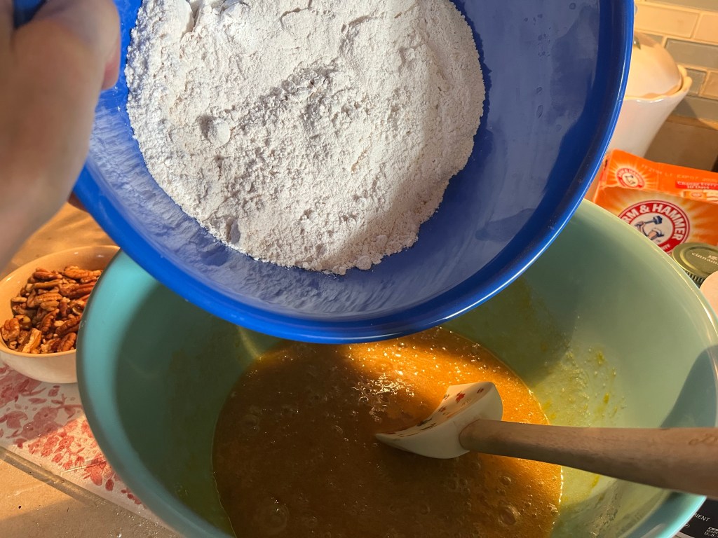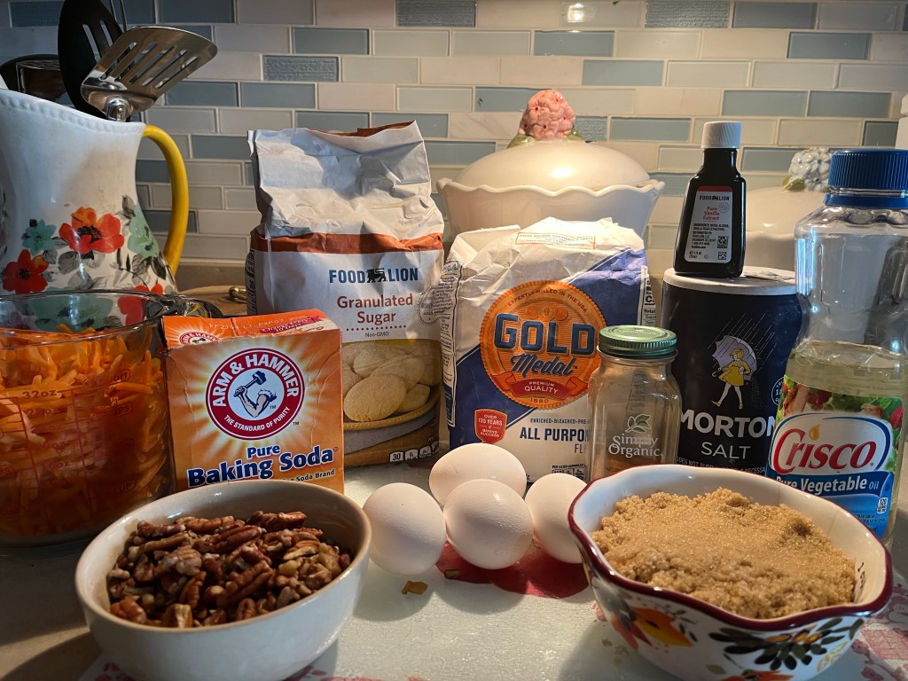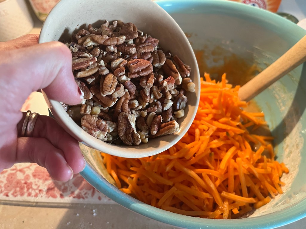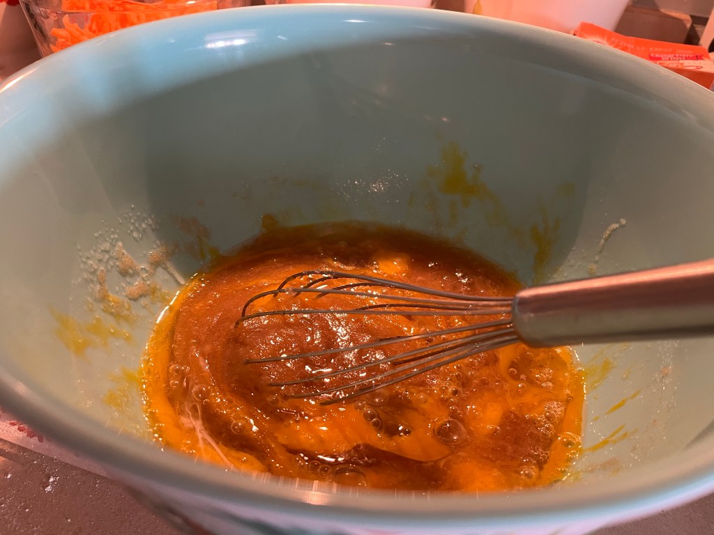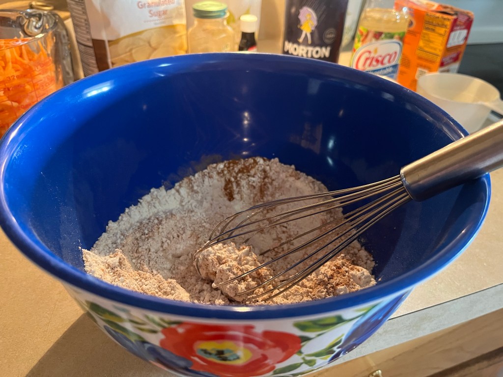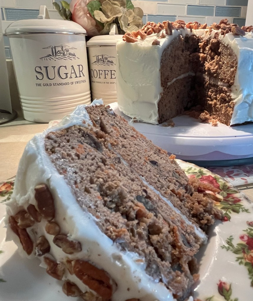 Here’s what you will need for the Carrot Cake batter Whisk flour, baking soda, salt, and cinnamon in a medium bowl until very well blended.In a separate bowl, whisk the oil, granulated sugar, brown sugar, and vanilla.Add the eggs one at a time and whisk after each one Add the flour mixture Switch to a large rubber spatula. Scrape the sides and bottom of the bowl, then add the dry ingredients in three parts, gently stirring until they disappear and the batter is smooth.Add the carrots…and the nuts. I used a mixture of pecans and walnuts. Divide the cake batter into two prepared cake pans: two greased 9-inch round cake pans. Line the bottom with parchment paper and then grease the top. Or grease and flour the bottom and sides of both pans.Bake until the tops of the cake layers are springy when touched and when a toothpick inserted into the center of the cake comes out clean, 35 to 45 minutes.