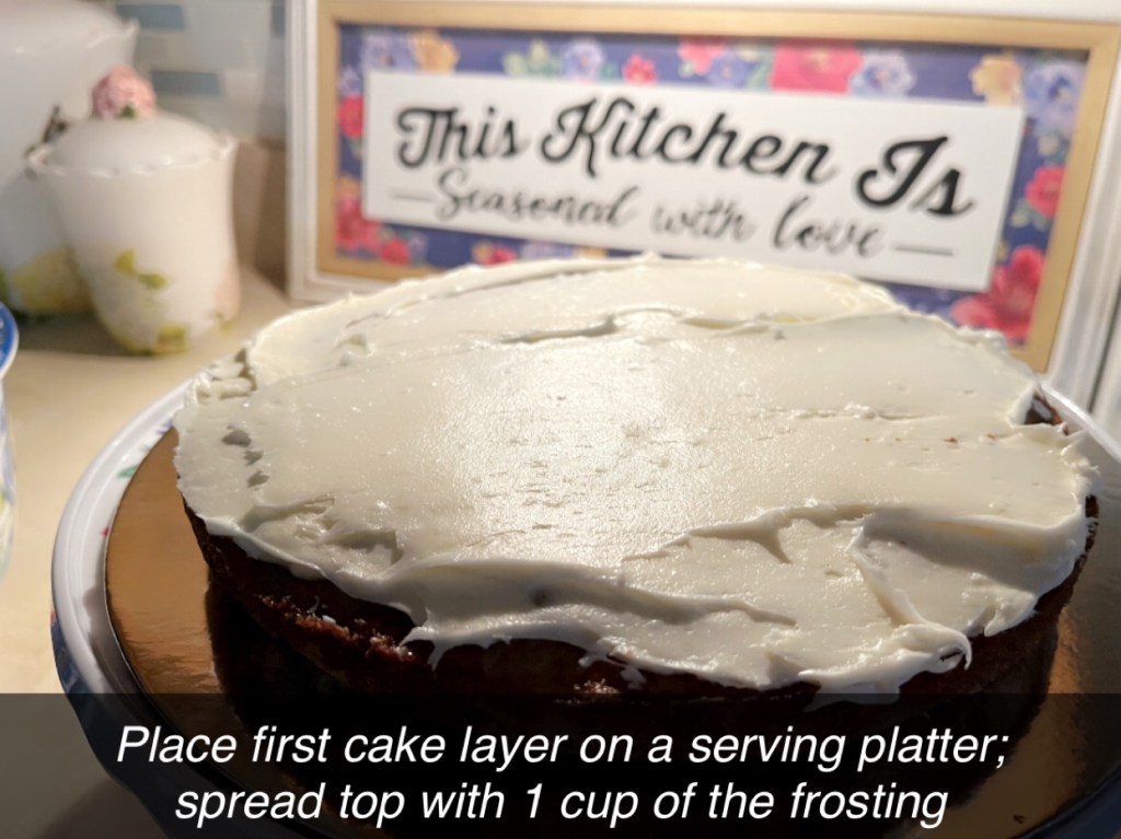 Top with second layer, and spread with 1 cup frosting. Top with third layer, and spread remaining frosting over top and sides of cake. Arrange pecan halves on top of cake in a circular pattern.