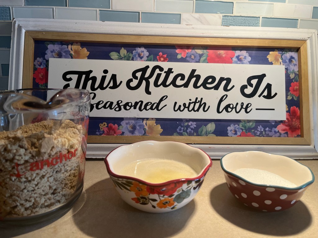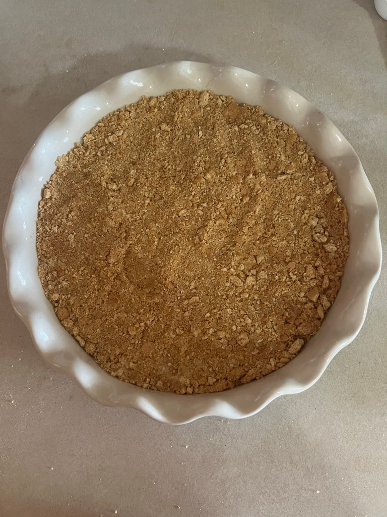 Here’s what you’ll need for the crust: 12 whole Graham Crackers (crush in a food processor or blender. You can also put the crackers in a large gallon Ziplock bag and crush with a rolling pin – get your frustrations out and bang away!) + 1/4 Cup Granulated Sugar + 6 TBSP undated melted butter 🧈 Stir the graham cracker crumbs and granulated sugar together in a medium bowl and then stir in the melted butter. Crush away if you see any big Graham Cracker pieces. The mixture will be coarse. Did I mention to crush any large pieces??! Make sure mixture is like a granulated texture. As you can see…I still need to crush! Pour the mixture into an ungreased 8-inch, 9-inch, or 10-inch pie dish, Press lightly with your hands or a measuring cup. Don’t use too much force, muscle queens and kings! Pressing with too much force will make your crust hard. You want a nice delicious crust – no need to lose a tooth over it 😆