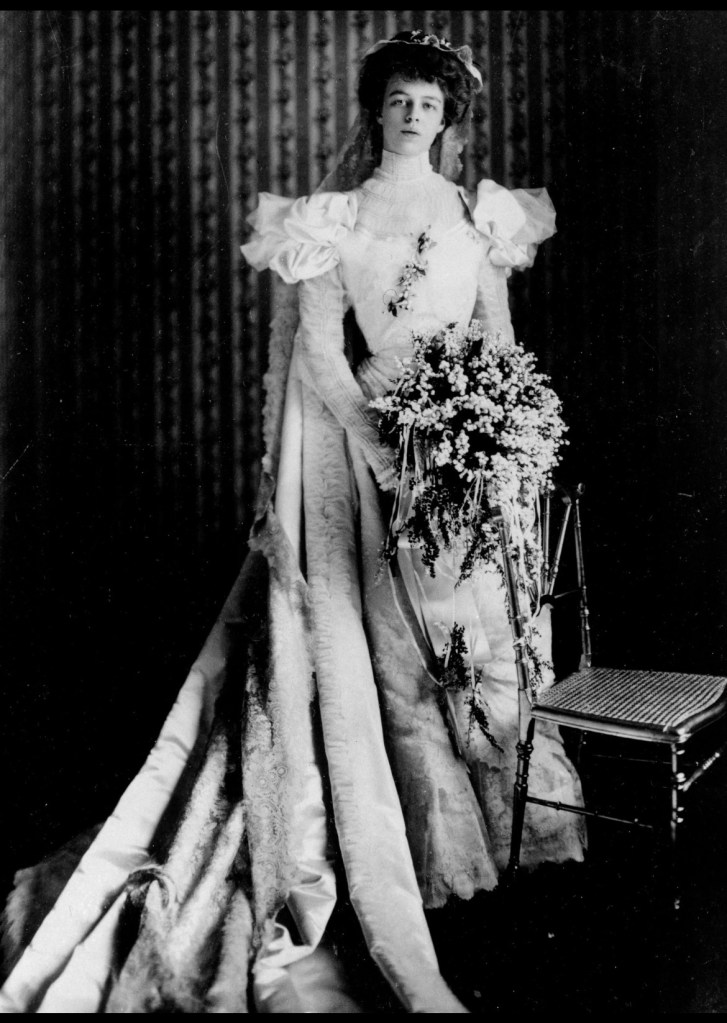 Following came the bride and the President. The bridal gown was a white satin princess robe, flounced and draped with old point lace, and with a white satin court train. The bride’s point lace veil was caught with orange blossoms and a diamond crescent. She wore a pearl collar, the gift of the bridegroom’s mother, and a diamond bowknot, the gift of Mrs. Warren Delano, Jr. Her bouquet was of lilies of the valley.