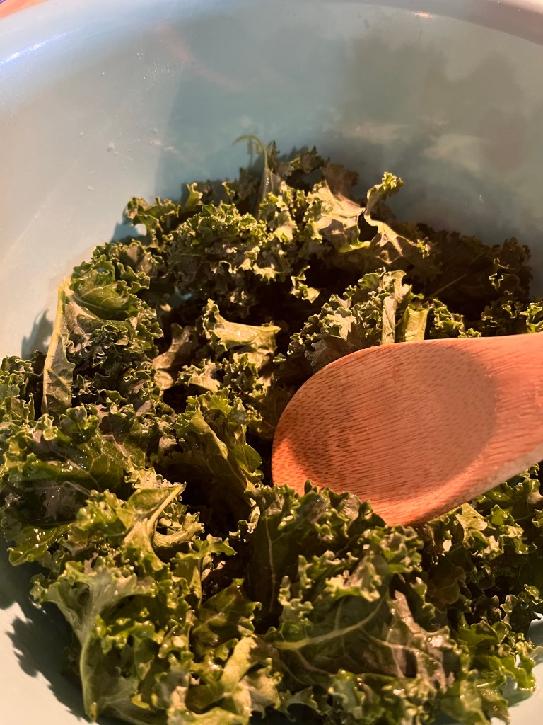 1 bunch kale. Remove the ribs and tear apart the kale into small pieces.