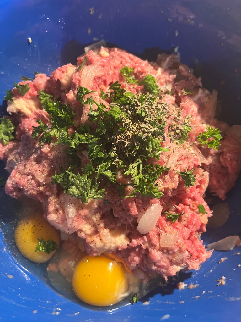 In a large mixing bowl, mix ground beef by hand with sauteed onions and garlic and bread pieces.