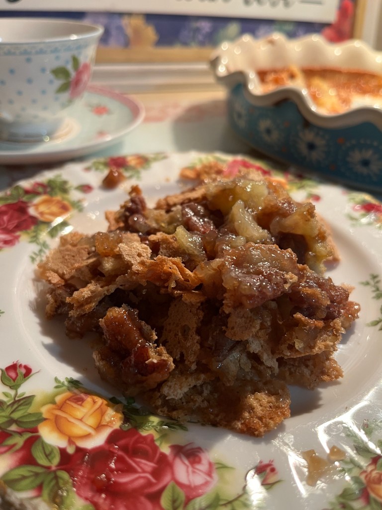 Ozark Pudding is kind of a cake-like fruit pudding with pecans. My husband (aka official taste tester) said it tasted like a pecan pie and apple crisp combination. He loved it!