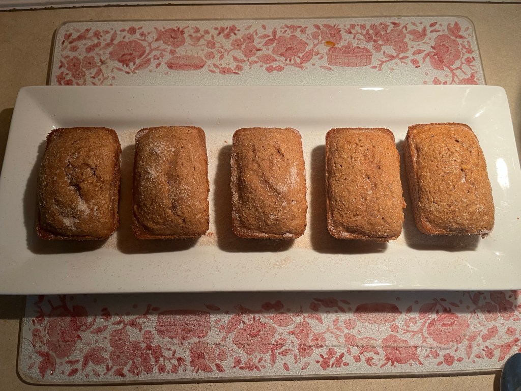 Preheat the oven to 350 degrees and grease either a bundt pan or mini bundt pan (I used mini loaf pans). You can also use a square baking pan.
