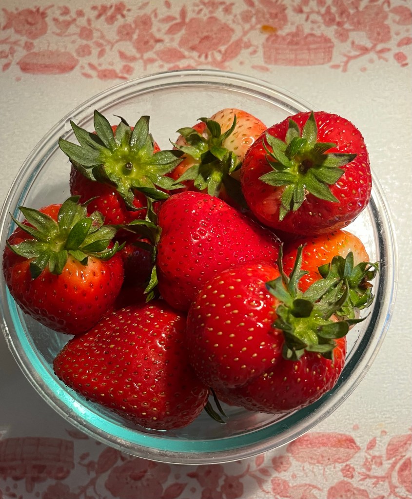 Add a dollop of cool whip or homemade cream. Add the chopped strawberries to the top. Enjoy!