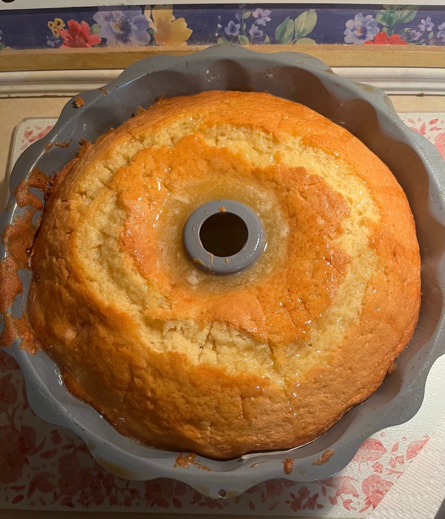 Slowly pour half of the glaze (about 3/4 cup) over the top of the cake, giving the cake time to absorb before adding more glaze. Allow the cake to rest for 10 minutes to allow the glaze to absorb fully.