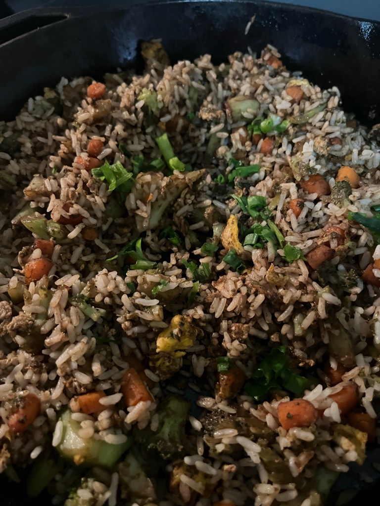Stir and fry the rice and veggie mixture until warmed through and combined.