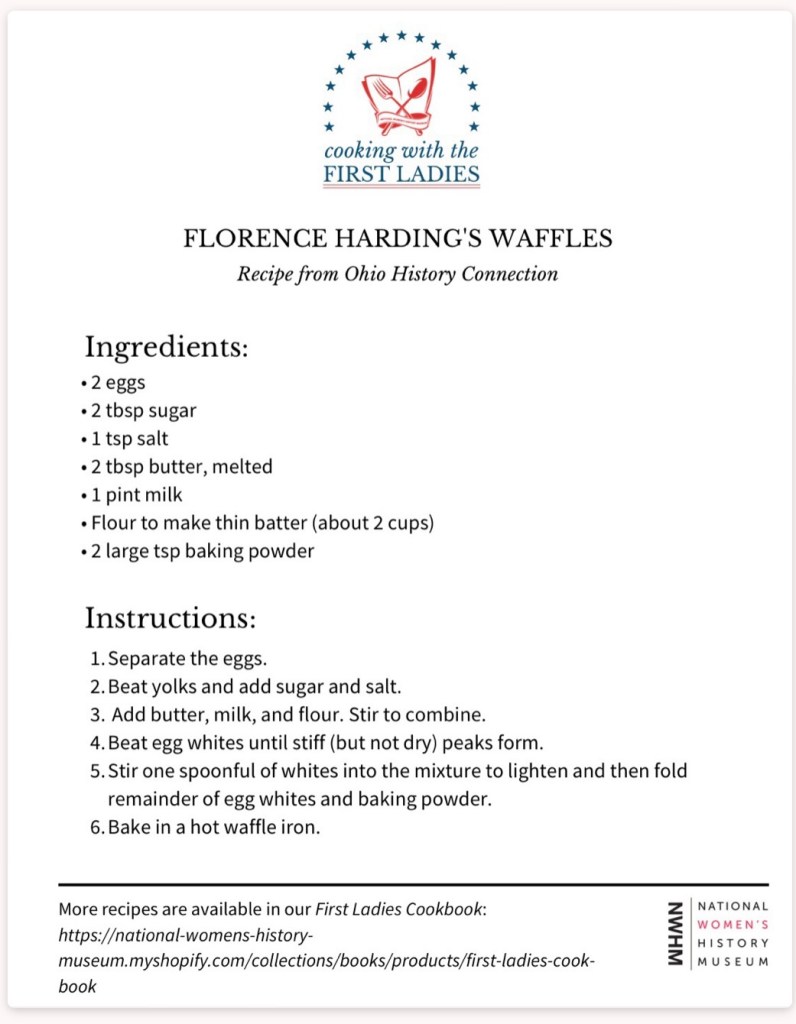 President Warren Harding and Mrs. Harding enjoyed waffles very much. If you ever get the chance to visit their home in Marion, the waffle iron can still be seen on the stove. There is also a plaque in the kitchen that reads, “You eat the first fourteen waffles without syrup, but with lots of butter. Then you put syrup on the next nine, and the last half-dozen you eat simply swimming in syrup. Eaten that way, waffles never hurt anybody.”